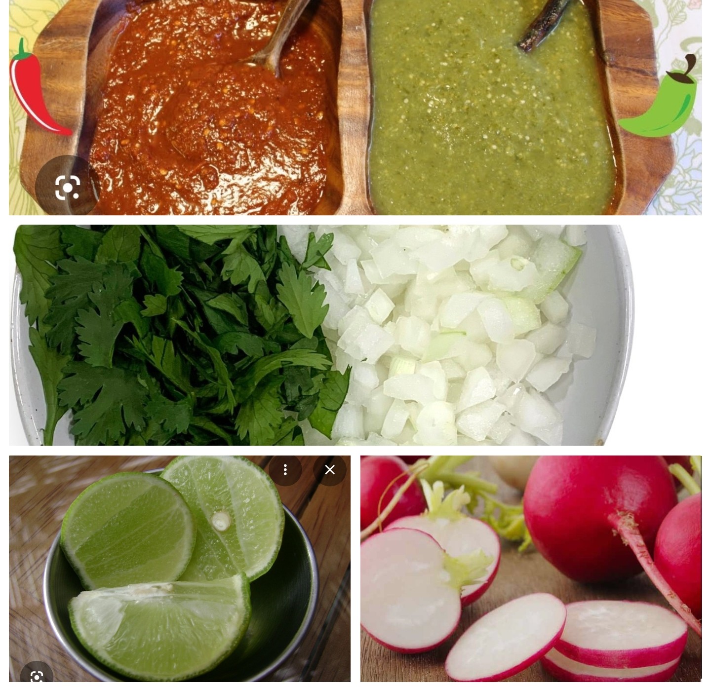 Cilantro, onion, relish, lime, grilled onions and jalapeƱos (peppers), rice, beans, red sauce, and green sauce